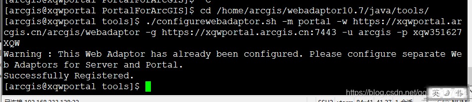 账户创建成功之后,导航至webadaptor目录,通过命令“./configurewebadaptor.sh -m portal -w https://xqwportal.arcgis.cn/arcgis/webadaptor -g https://xqwportal.arcgis.cn:7443 -u arcgis -p xqw351627XQW”来注册portal,如图: