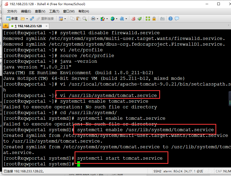 保存退出后使用命令“systemctl enable /usr/lib/systemd/tomcat.service”将服务添加到开机自启动中,然后使用“systemctl start tomcat.service”命令启动tomcat服务,如下: