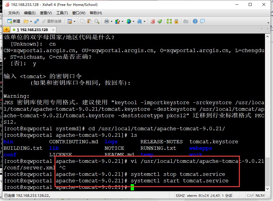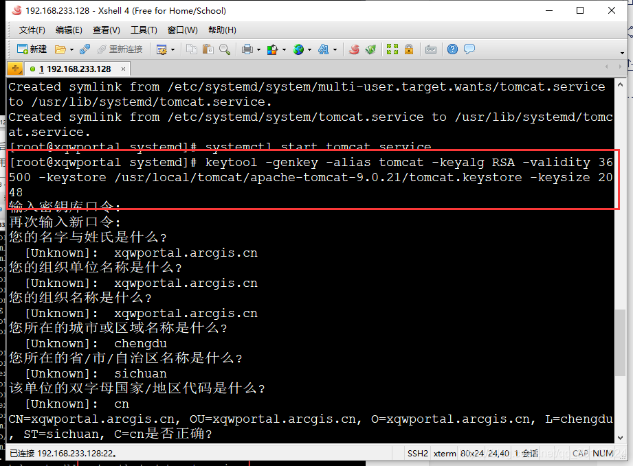 使用命令“keytool -genkey -alias tomcat -keyalg RSA -validity 36500 -keystore /usr/local/tomcat/apache-tomcat-9.0.21/tomcat.keystore -keysize 2048”来创建自签名证书,如下: