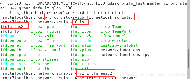 使用命令“cd /etc/sysconfig/network-scripts”进入到网卡配置目录,然后使用命令“ls”来查看当前目录下的所有文件,发现有文件“ifcfg-ens32”,此文件就是网卡的配置信息,使用命令“vi ifcfg-ens32”来打开编辑此文件,如图: