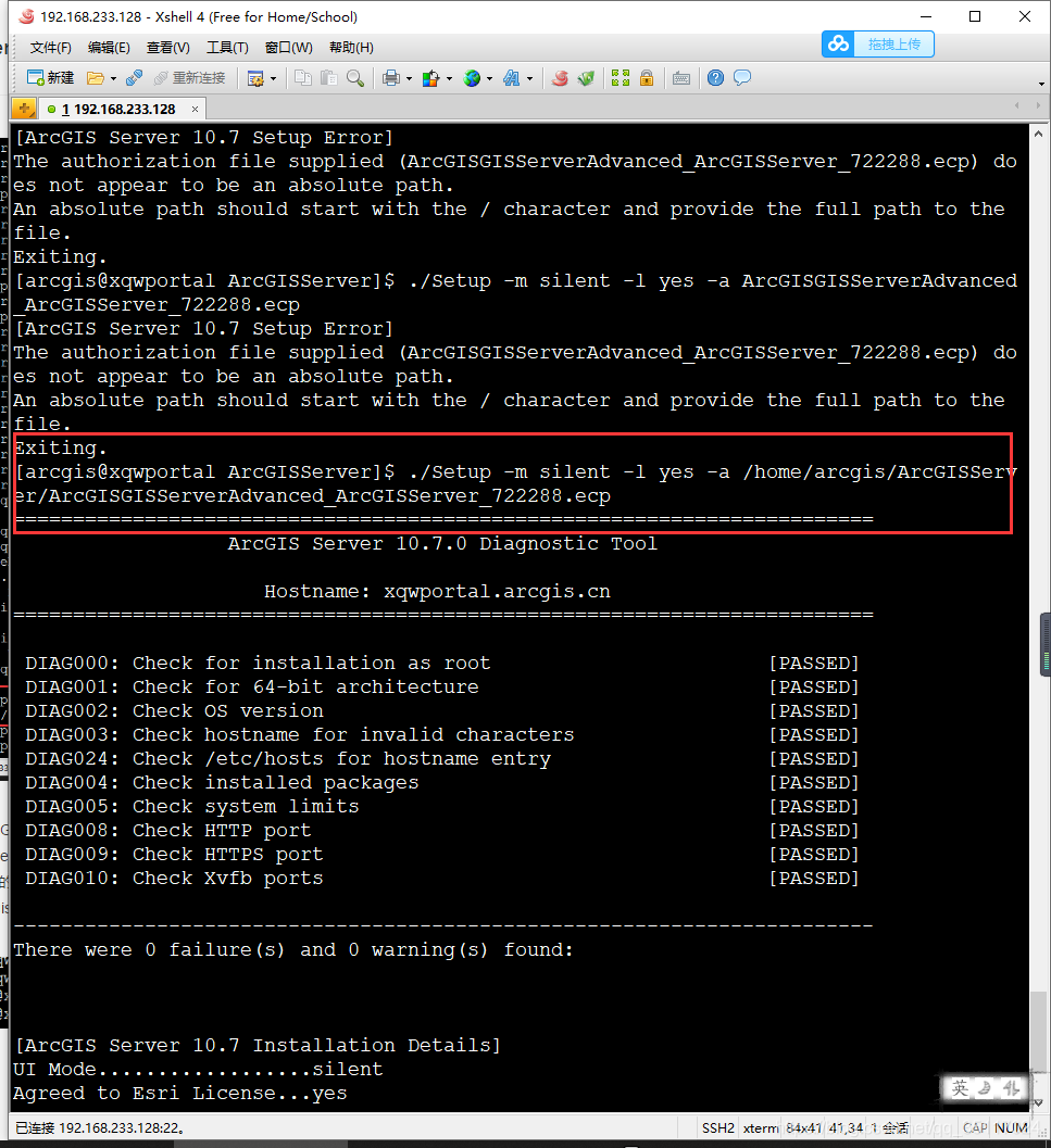 将安装包拷贝至和上述步骤相同的目录,切换回arcgis用户,解压,进入到解压后的文件夹,使用命令“./Setup -m silent -l yes”进行安装,如图: