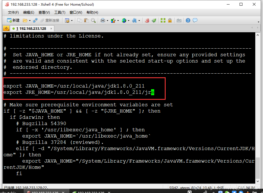 使用“vi /usr/local/tomcat/apache-tomcat-9.0.21/bin/setclasspath.sh”命令添加java_home和jre_home的路径,如下:
