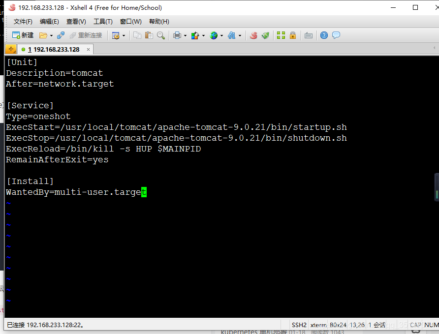 使用“vi /usr/lib/systemd/tomcat.service”命令创建tomcat服务,然后在此文件里添加如下内容: