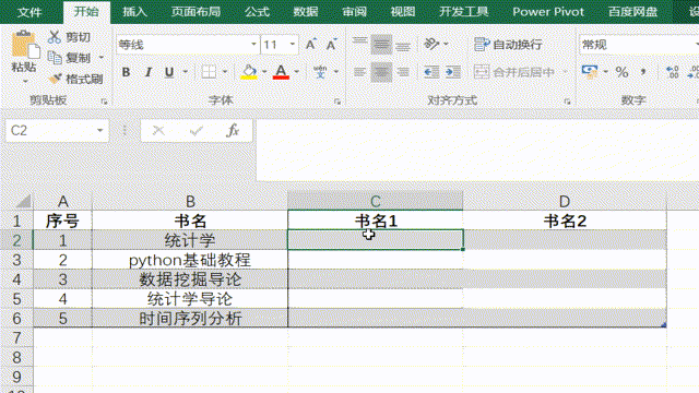 快捷键“ctrl+E”还有哪些哪些功能呢?我们继续往下看,下面的表格中是一些书的名字,现在我们想为这些书添加书名号,比如将统计学,变成《统计学》。