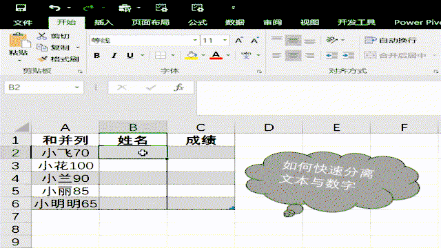 处理这样的数据,我们需要先空出两列,先按照姓名填好第一个单元格的内容,之后选择好后面几个空白单元格,按住“ctrl+E”,后面单元格就自动填充完成。接下来是成绩列,与“姓名”列同理。我们需要注意的是,姓名列和成绩列是无法同时进行多列填充的。