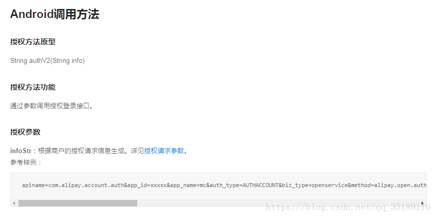 首先我们看到这是官方文档的一张截图,一眼看过去你会很迷糊,只知道方法名为authV2然后要传入String类型参数,而这个String呢就是授权请求参数,这个请求参数呢,在项目中呢推荐是要后台拼接好返回给你,这样是为了安全起见!具体有如下: