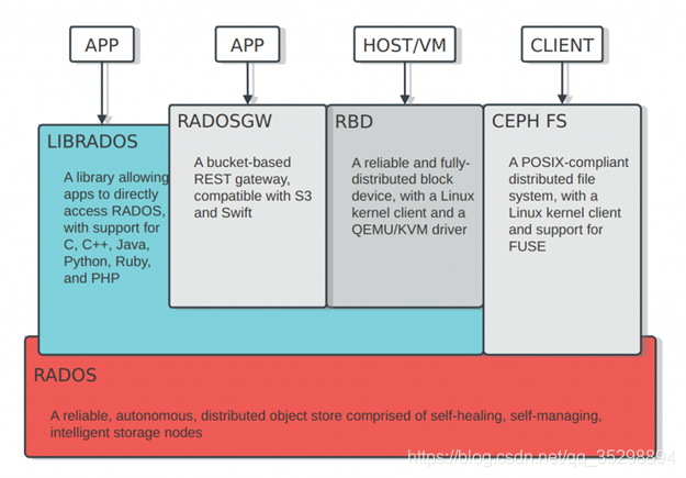 Ceph的底层是RADOS,它的意思是“A reliable, autonomous, distributed object storage”。 RADOS由两个组件组成: