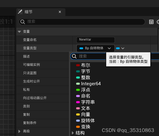 接下来回到我们的人物蓝图类里,首先我们要创建一个事件图表,然后进入蓝图,首先创建变量,然后在变量的细节里边找到我们刚才创建的蓝图类的方法名,这样就能对应上了