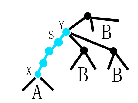 假设这条路径就是X–Y,那么另一条路径的一个端点会在A这个集合中,另一个端点会在B这个集合里,也就是不在S的子树里。(S是X到Y路径上Y的儿子)。