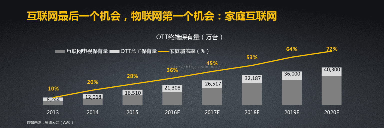 中国互联网已经历PC互联网时代,目前正处的移动互联网时代也出现了增长放缓,人口红利结束。于是,新的互联网时代出来了——物联网。以智能电视为核心的家庭互联网在物联网发展中是相对成熟的,将接棒移动互联网,被业内人士普遍认为是下一个互联网风口。