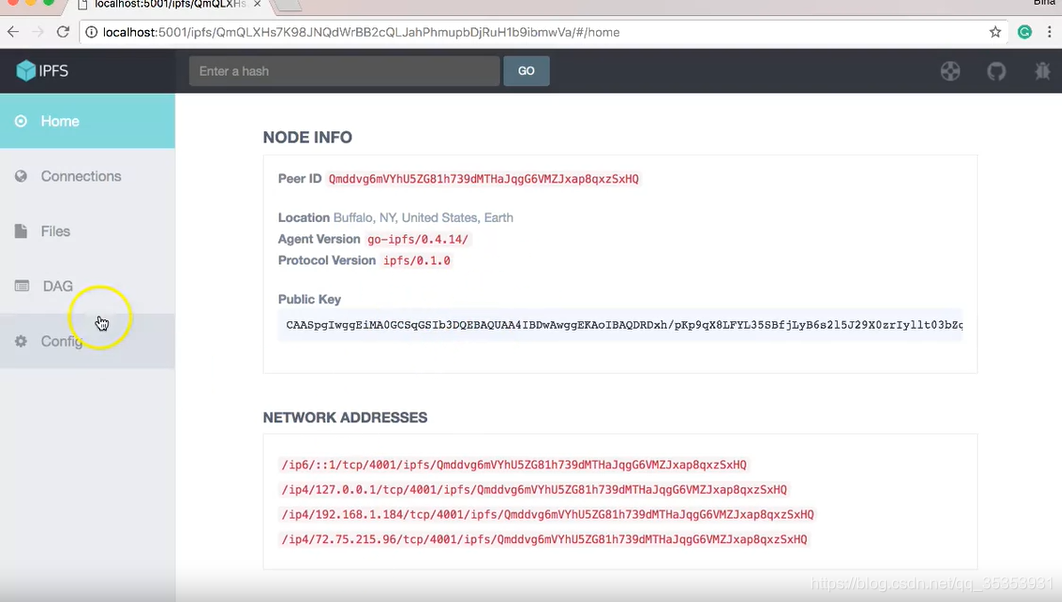 打开web界面。它显示你创建的节点的 peer ID,Agent Version,Protocol Version,Public Key,一些network addresses.