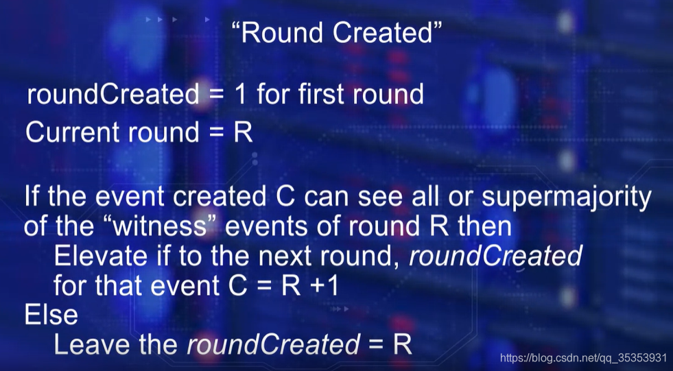 我们定义roundCreated 如下:设当前回合 Current Round 为 R。如果所创建的事件C可以全部或绝大多数见证事件回合 R,然后到下一轮,事件C的 Round Created 的值是 R+1。否则,将roundCreated属性值保留在R,并将事件保留在该轮中。
