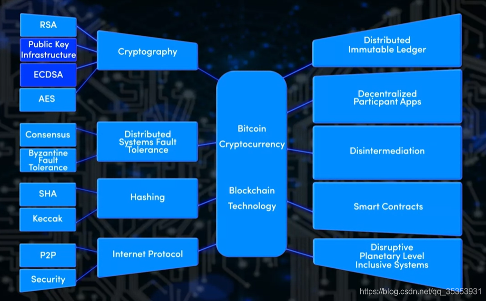 蝴蝶效应被定义为一个初始状态的小扰动,最终达到有重大影响的结果。这是在混沌理论的背景下定义的。毫不夸张地说,比特币对科技产生了蝴蝶效应。比特币创造性地综合了过去四个十年的研究成果,以发布并以一种工作模式建立了点对点数字支付系统 peer to peer digital payment system。这个奇异的想法打开了潘多拉魔盒的技术盒,并引发了努力甚至可能是一场社会革命。 比特币的区块链创新源于PKI,ECDSA,SHA等密码学和哈希技术的研究,以及用于P2P传输的互联网技术的巨大进步。这使得区块链的去中心化、去中介化和DLT成为可能。面向对象编程语言中的有限状态机用于开发智能合约。Web技术被用于区块链的DApp开发。 从这些中,您可以看到由比特币区块链带来的转变。如您在这里看到的,区块链具有众多不同的应用程序。