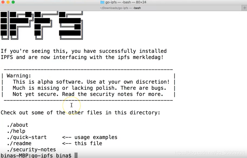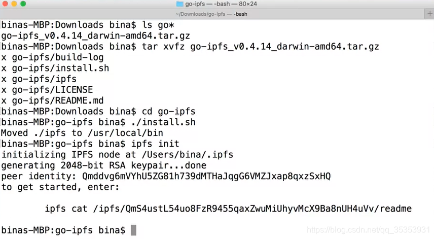 我已经下载了tar文件,解压缩。进入IPFS,进行安装。 接下来我将对其进行初始化,并且在您对其进行初始化时,您会获得很多细节。您可以看到该身份(大约32个字节),并且可以看到它是base58,就像在比特币中一样,这样我们就可以在其中容纳更多信息。然后,让我们看看我们的IPFS系统是否工作。所有IPFS命令都以IPFS开头,这里有一句 IPFS cat 或只是Unix的串联,它仅显示文件名和IPFS文件系统。这是对文件夹web的引用,其中包含用于IPFS的当前文件夹web readme。
