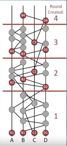 我们将讨论事件的 roundReceived 属性,稍后就该事件达成共识。Limenberg对哈希图实例的描述是一个由四个参与者A、B、C和D组成的小网络。A1、B1、C1、D1是第一回合的基本事件。所以他们是第一回合的目击者。回想一下,参与者的见证事件是特定行的第一个事件。例如,对于第3行,A3,B3,C3,D3将是该行的四个参与者A,B,C,D的见证事件。