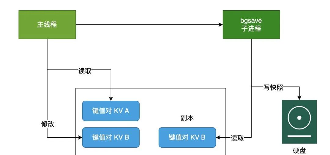 如果主线程执行写操作,则被修改的数据会复制一份副本,然后 bgsave 子进程会把该副本数据写入 RDB 文件,在这个过程中,主线程仍然可以直接修改原来的数据。