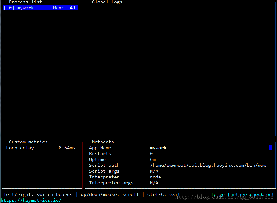 $ pm2 monit 监视每个node进程的CPU和内存的使用情况