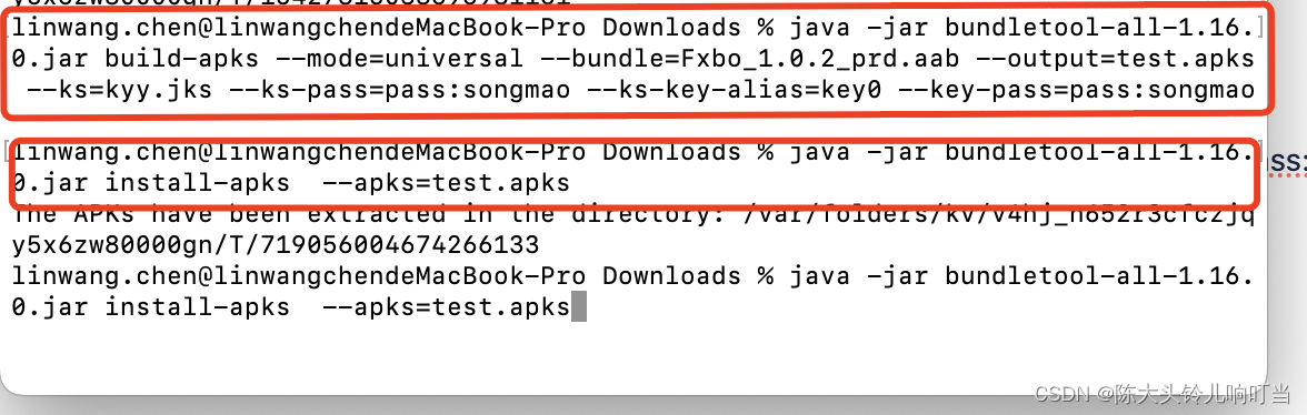 Mac环境 aab包转apks,并安装apks 等转换成功后,download目录下会出现test.apks 文件,继续通过命令行安装。xxx是你的aab的名称,test.apks是转化后的安装包名称。