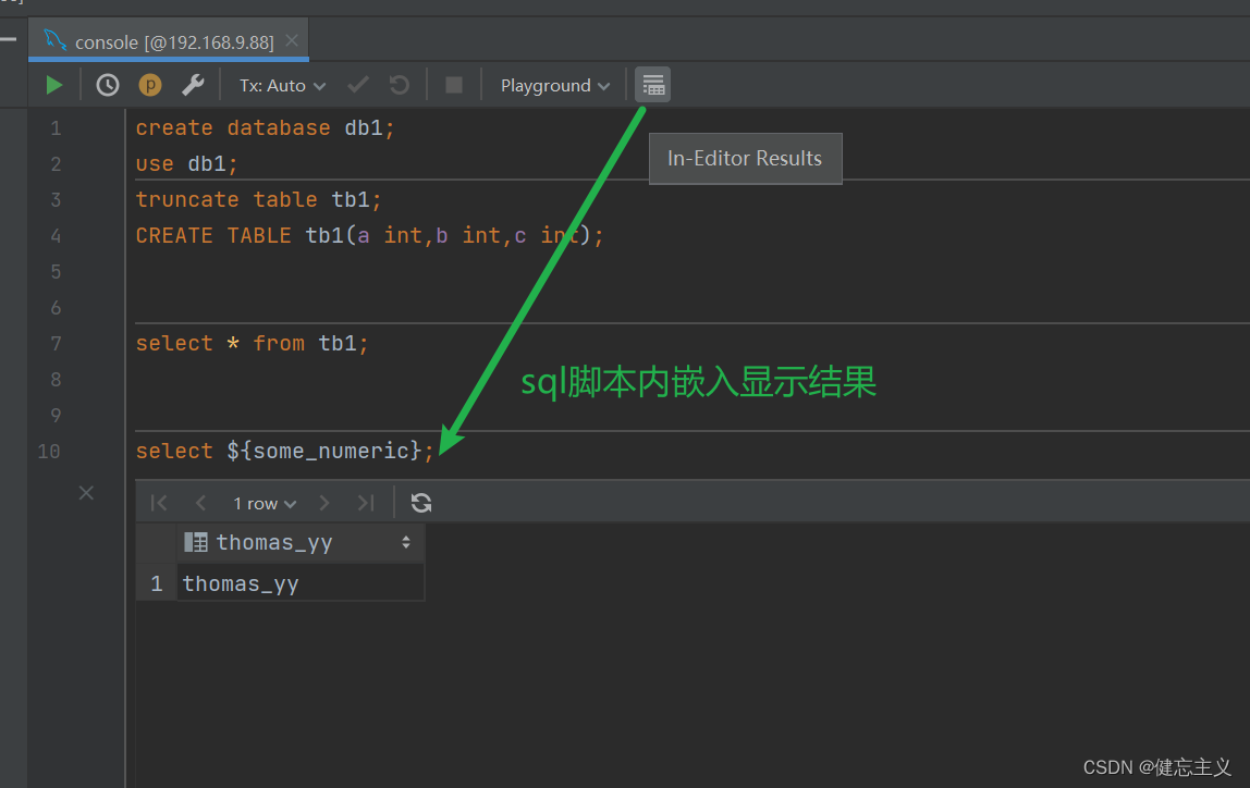 比如ip之类的参数需要使用. 这样每次可以用 ${ip} 表示,然后dataGrip根据语法自动识别该变量,就算sql中多次使用,你通过参数 P 按钮修改一次,全局生效. 提高便利性.