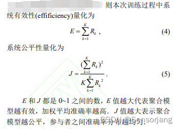 联邦学习论文笔记——一种联邦学习中的公平资源分配方案(田家会 α-Fedavg) 首先定义用户效用:Rk=ak·pk(实际用户效用=模型准确率·聚合权重)(模型准确率指,本轮中心参数服务器下发给参与者的全局模型,经参与者自己计算后获取的的准确率)(聚合权重指,本轮中,各个节点将自己的梯度或模型参数发给中心参数服务器后,参数服务器根据【①上传的参数或梯度②上传的准确率】为各个参与者设计的聚合权重)对于每个用户来讲,即希望准确率a高也希望聚合权重p高,用乘积作为效用进一步定义系统 有效性量化E、公平性量化J:是所有用户效用的和,它越高说明整个系统的有效性越高。