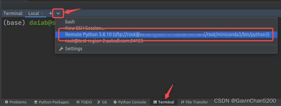 配置好PyCharm远程开发后,可以在PyCharm的终端中下拉找到远程服务器打开远程终端: