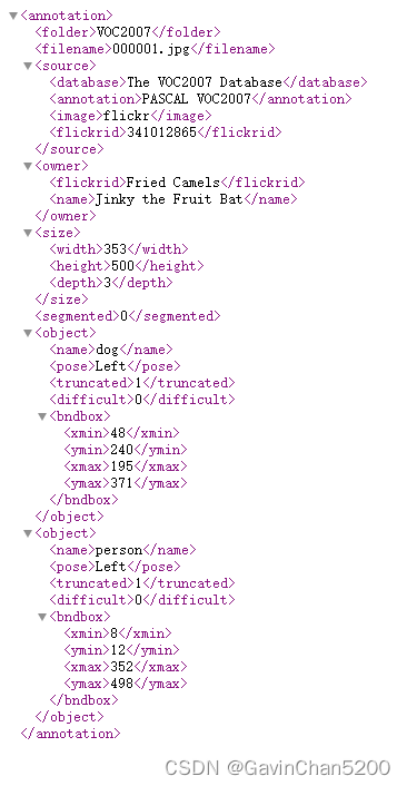 其中包括图像各类标签:<source>包括图像的来源信息(数据库名称、注释类型及图像来源类型标识),<owner>所有者信息,<size>图片的尺寸信息,<object>图像的物体信息,也就是VOC2007的类以及<bndbox>类的边界框坐标信息。
