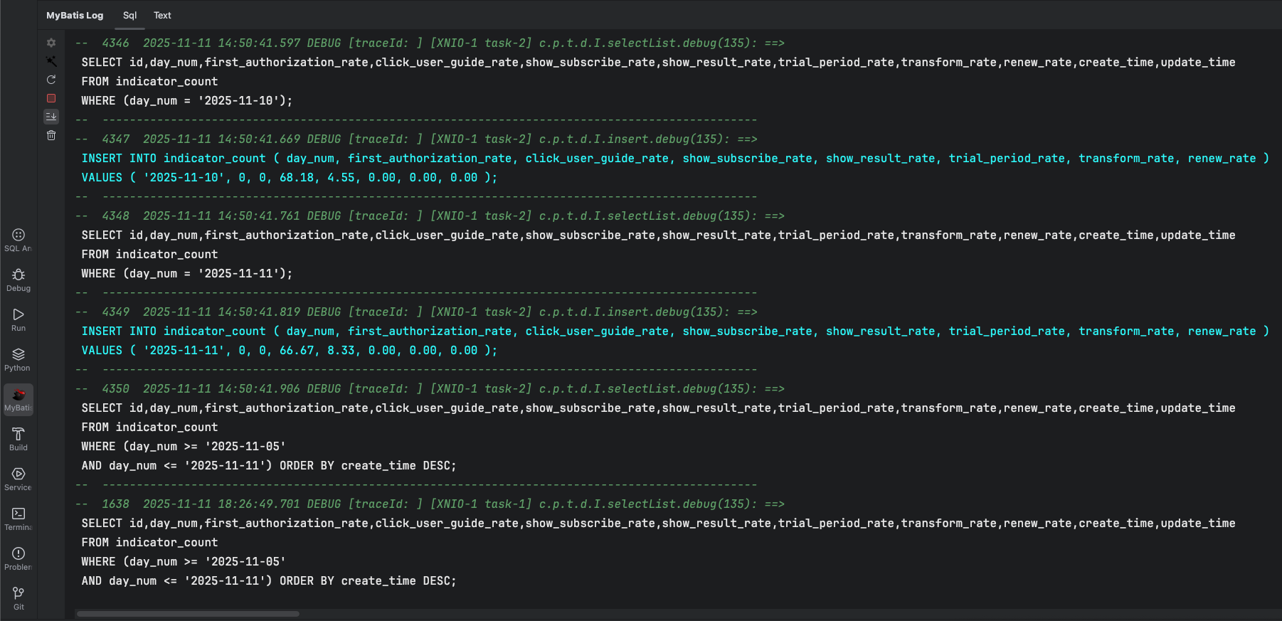 插件会自动解析原始日志,在「MyBatis Log」面板中生成 带真实参数的完整 SQL(图3)!