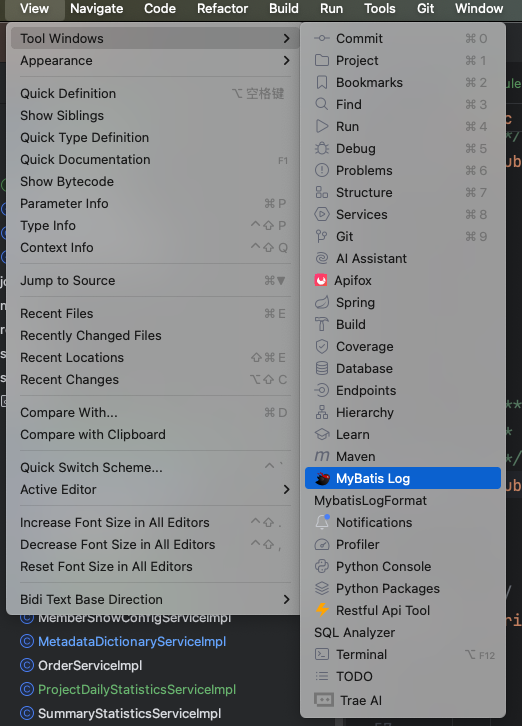 重启 IDEA 后,点击顶部菜单栏「View」→「Tool Windows」→「MyBatis Log」(或直接在 IDEA 右侧找到「MyBatis Log」标签,图2);