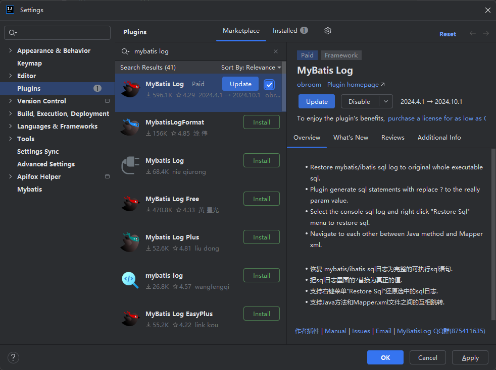 在左侧找到「Plugins」→ 顶部搜索框输入「MyBatis Log」→ 选择任意一个高评分插件(比如「MyBatis Log Free」)→ 点击「Install」安装(图1);