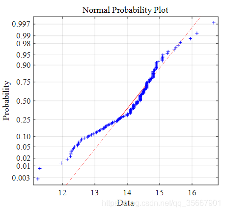 第二个为normplot,其中横轴为变量区间,纵轴为累计概率分布(CDF),红色点划线为根据分析数据均值和方差构建的正式正态分布线,蓝色点为分析样本点,越接近于直线说明样本正态特性越好,由图可知,分析数据尾部远离直线,且中间大量样本分布处(14.5)样本低于直线,因此该分析数据正态性差,或者不服从正态分布。