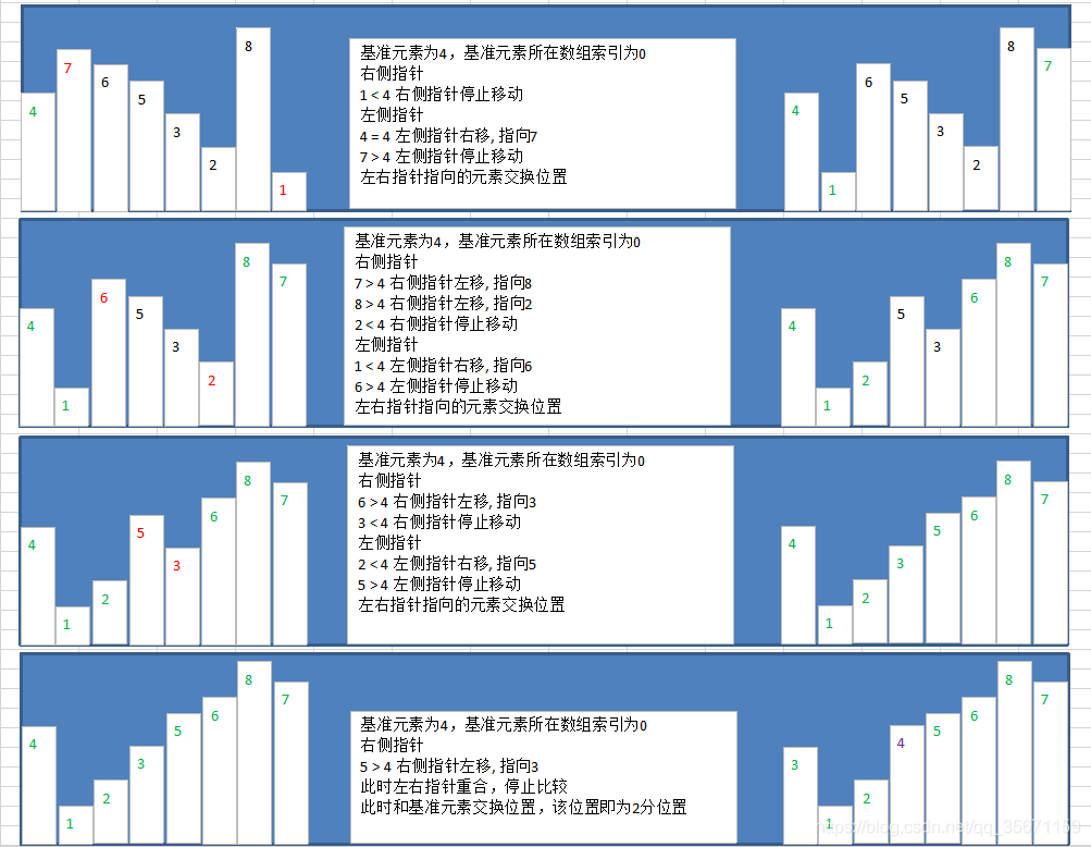 1)数组{4, 7, 6, 5, 3, 2, 8, 1}以4为基准,分治数组