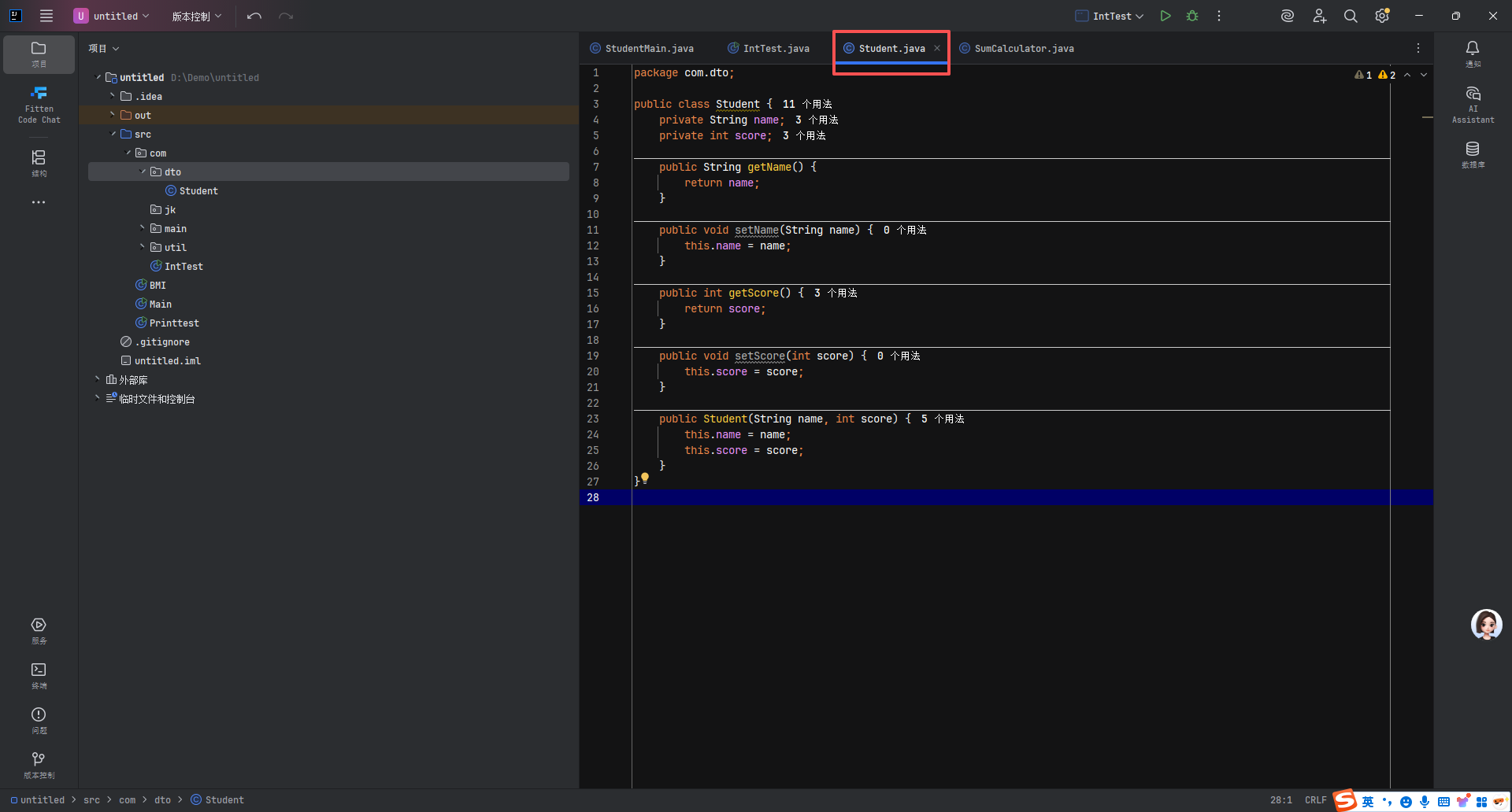 当前打开了 4个标签页,编辑完Student.java后,按Ctrl + F4关闭该标签页,专注于剩余3个文件的开发。