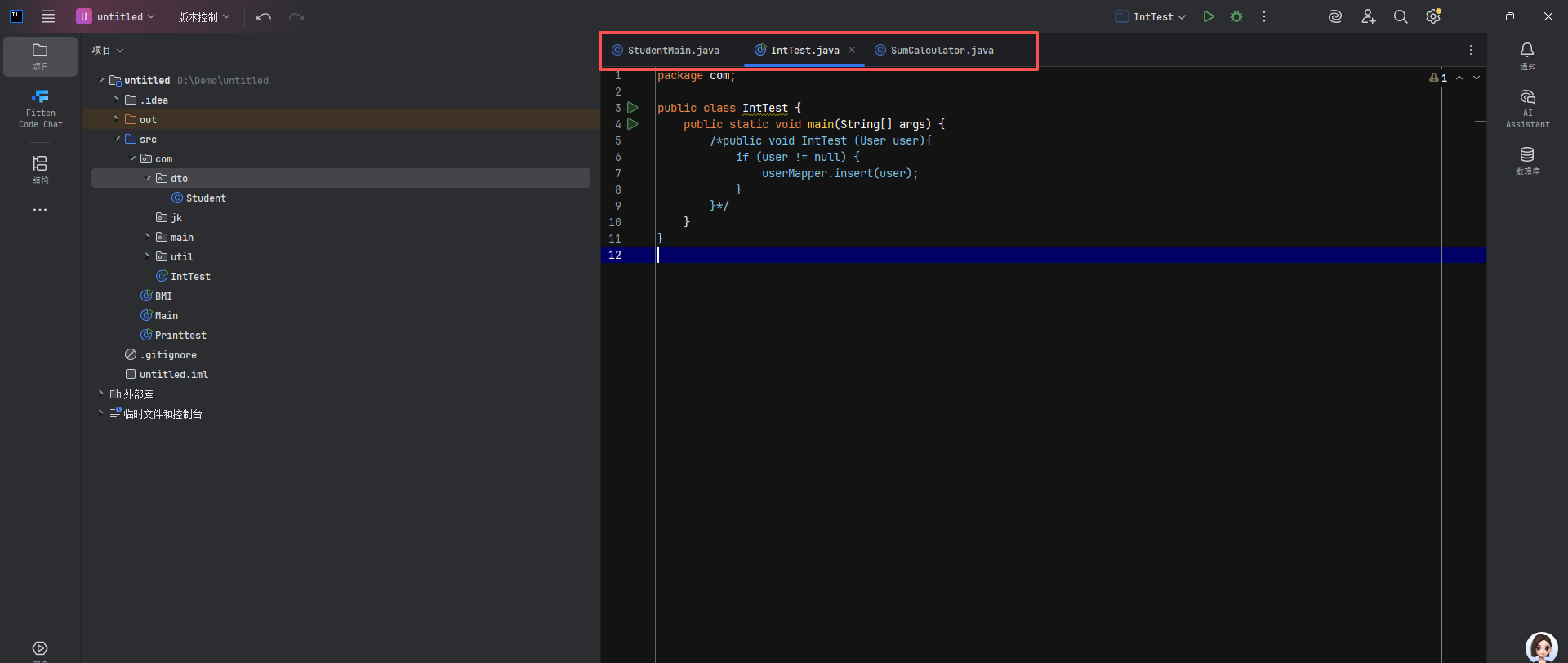 - 单行注释:选中userMapper.insert(user);,按Ctrl + /,变为// userMapper.insert(user);;