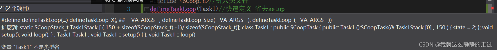 SCoop库定义线程是用以下两种语句defineTask(Task1);defineTaskLoop(Task2);报错信息如下可见,这个看似函数的玩意,只是利用#define给扩展成了一个大的类,并在其中实现setup和loop这两个函数,而在这么大的一个扩展中,最后定义完类,直接就用类名定义了一个变量也就是Task1Task1;所以会导致“变量Task1不是类型名”,毕竟是把辛辛苦苦定义的类型名,又给定义成了变量。。可不就得报错么。改起来也不难,就把变量名改一下就...