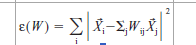 它将所有数据点之间的距离平方和它们的重建相加。权重Wij表示第j个数据点对第i个数据点重建的贡献。为了计算权重Wij,我们最小化了受两个约束的代价函数:首先,每个数据点Xi仅从其邻居(5)重构,如果Xj不属于Xi的一组邻居,则强制Wij=0;第二,权重矩阵的行和为: