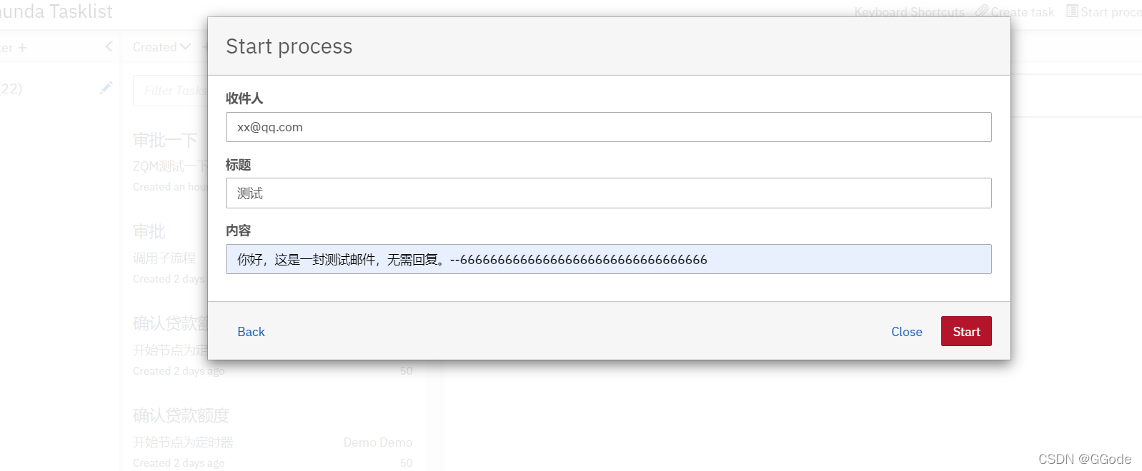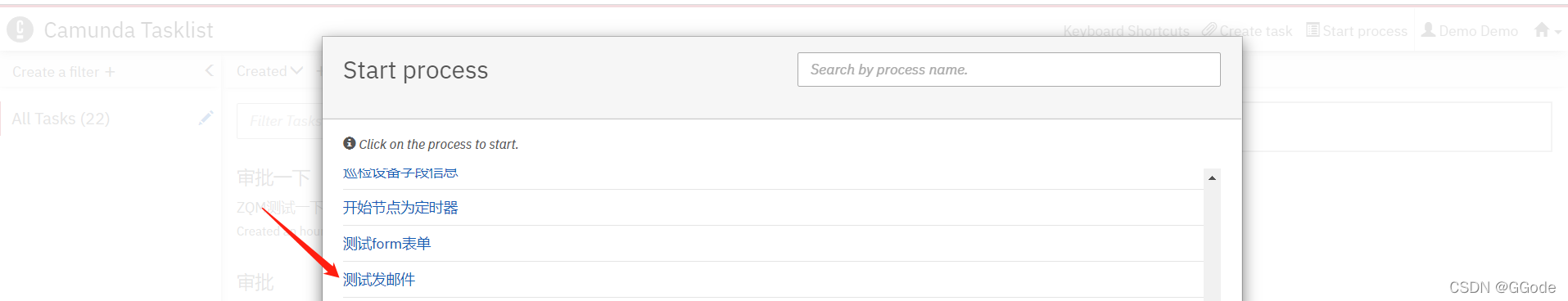 访问camunda引擎地址在tasklist里点击Start process 选择刚才保存的流程