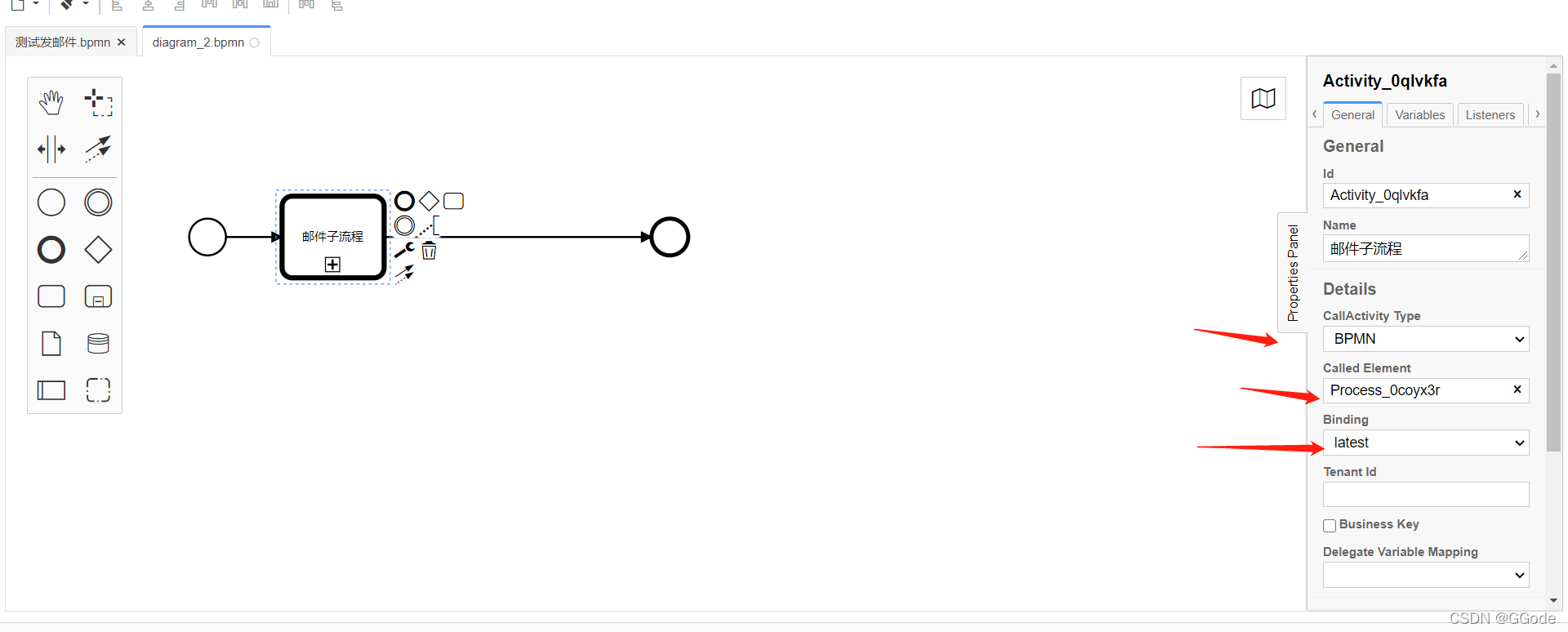 2、 Call Activity选择BPMN,Called Element是刚才创建好邮件发送流程的id,Binding可以选择调用最后一个版本,也可以指定版本