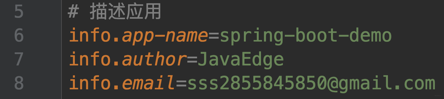 通过设置Spring属性info.*,你可以定义info端点暴露的数据。所有在info关键字下的Environment属性都将被自动暴露,例如,你可以将以下配置添加到application.properties:
