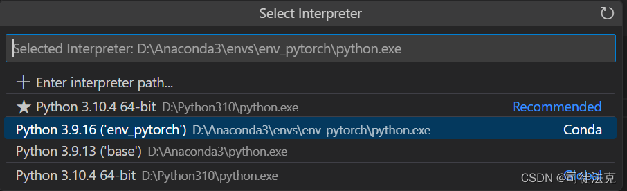 3.接着出现下图样式(也有可能没有上图,直接出现下图样式)。选择对应的解释器,或者点Enter interpreter path,输入你想指定的解释器的位置路径