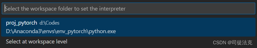 2.点击后可能会在vscode上方出现下图样子,如果出现下图,则点击第二项Select at workspace level,