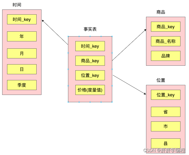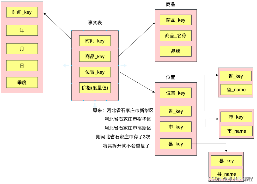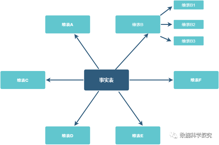 当一个或多个纬度表没有直接连接到事实表,而是通过其他维度表连接到事实表时,其图解就像多个雪花连接在一起,故称雪花模型。雪花模型是对星型模型的扩展,它对星型模型的维度进一步层次化。