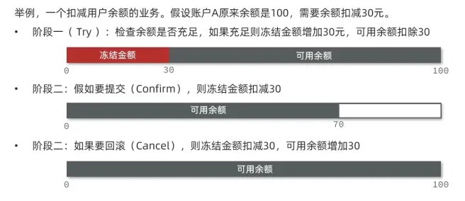 Try:资源的检测和预留;Confirm:完成资源操作业务,要求Try成功,Confirm一定能成功;Cancel:预留资源释放,可以理解为Try的反向操作。