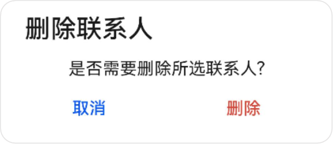 给您的应用添加弹窗 在我们日常使用应用的时候,可能会进行一些敏感的操作,比如删除联系人,这时候我们给应用添加弹窗来提示用户是否需要执行该操作,如下图所示:弹窗是一种模态窗口,通常用来展示用户当前需要的或用户必须关注的信息或操作。在弹出框消失之前,用户无法操作其他界面内容。确认类:例如警告弹窗AlertDialog。选择类:包括文本选择弹窗TextPickerDialog 、日期滑动选择弹窗DatePickerDialog、时间滑动选择弹窗TimePickerDialog等。您可以根据业务场景,选择不同类型的弹窗。