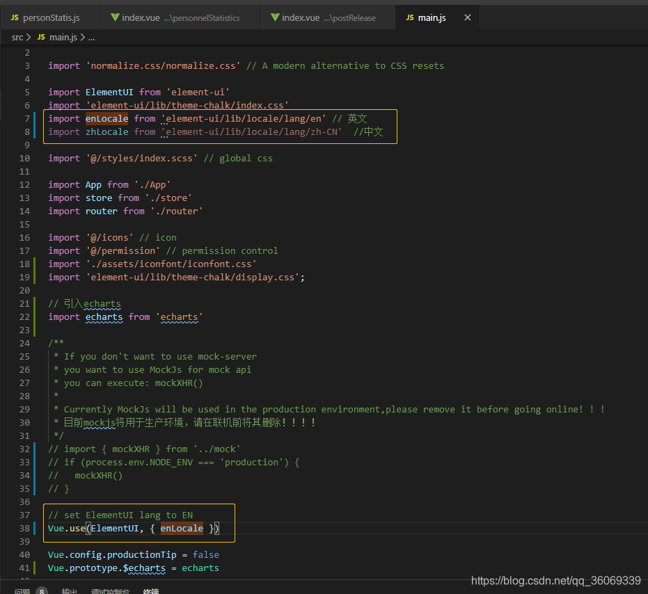出现英文的原因:项目在main.js文件里设置的默认语言为英文。