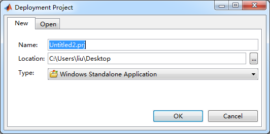 在MatLab的命令窗口中,输入deploytool,或者利用菜单选项,file-new-deployment project打开创建dll文件的工程创建窗口,如下图所示。