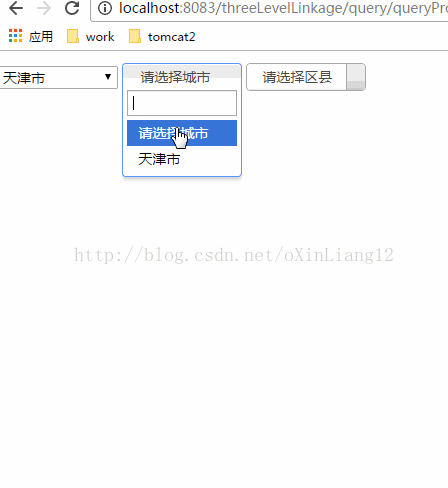 至此堪称完美的效果已出,考虑到可能有些朋友可能会感觉到云里雾绕,所以博主自己搭建了一个spring、springmvc、Mybatis框架的demo,是省市区县的三级联动。