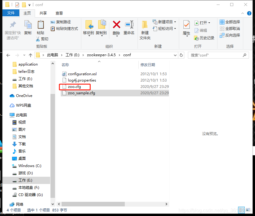 进入config目录下,将原有的zoo_sample.cfg文件复制一份,重命名为zoo.cfg.