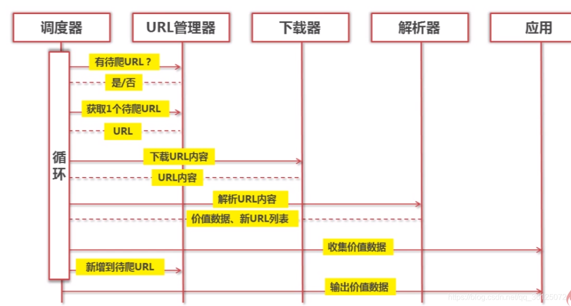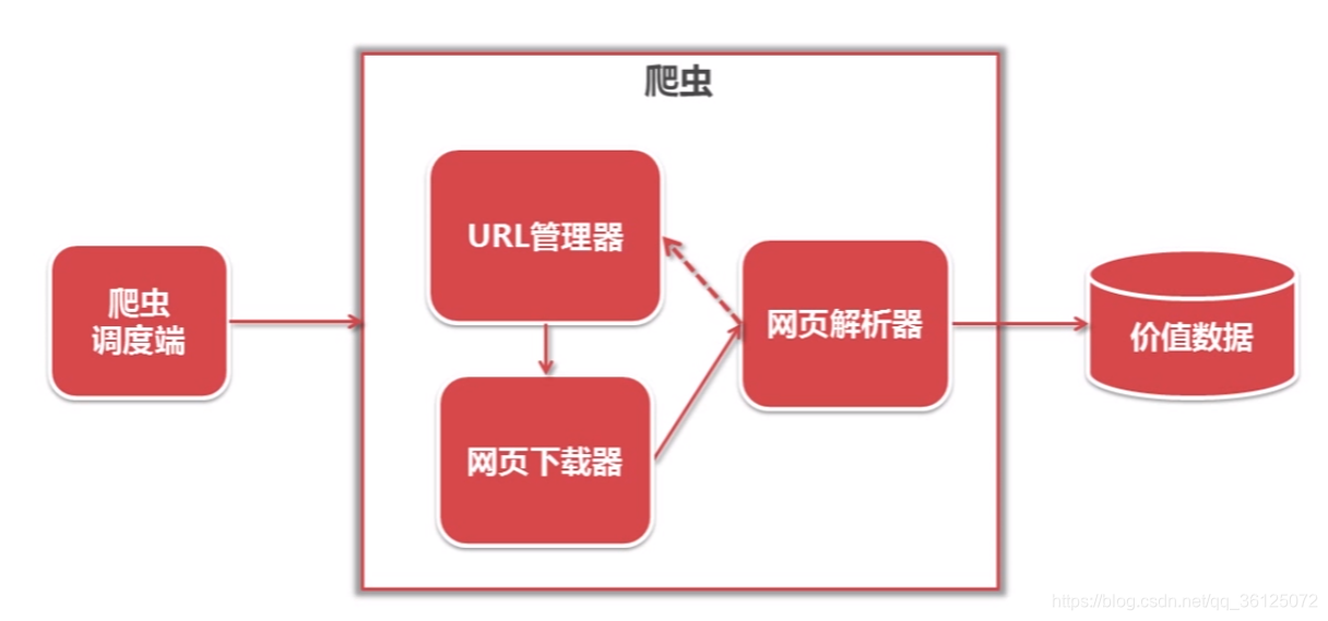 在这个简单的爬虫框架中,我们可以看到三个主要的组成部分,其中URL管理器负责管理需要去访问的URL;网页下载器负责下载正在访问的页面的html数据;网页解析器负责解析html中的数据信息,同时将需要用到的URL传送给URL管理器;这样一来,三者形成了一个循环,这个循环可以帮助我们访问互联网。