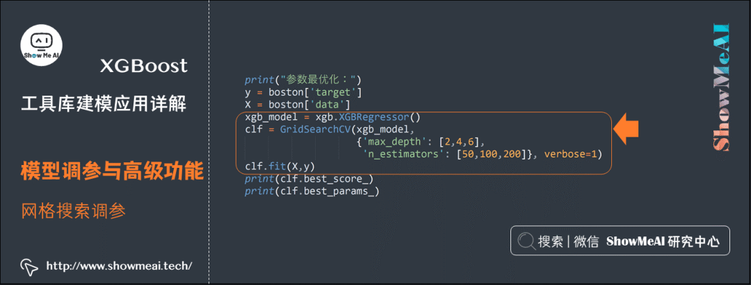 如下是一个典型的网格搜索交法调优超参数的代码示例,我们会给出候选参数列表字典,通过GridSearchCV进行交叉验证实验评估,选出 XGBoost 在候选参数中最优的超参数。