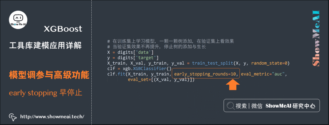 下面是对应的代码示例,其中参数early_stopping_rounds设定了验证集上能接受的效果不提升的最多轮次数,eval_set指定了验证数据集。